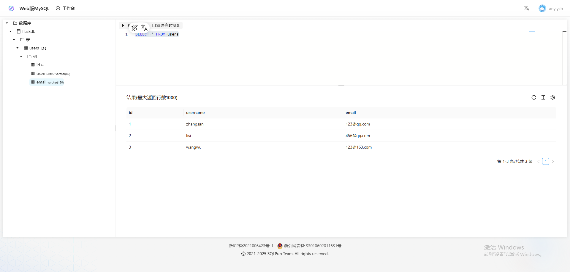 return f'<User {self.username}>'这里定义了一个用户模型,对应数据库中的用户信息表,属性包括:id、用户名和email,对应的mysql表如下: