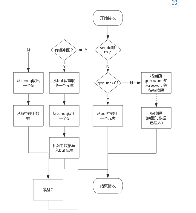 若sendq为空,且无缓冲区,则将当前协程加入recvq等待有数据后被唤醒