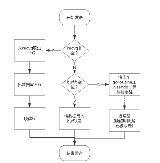 若sendq不为空,且有缓冲区,则取buf的recvx位置的数据,并将sendq头的协程数据放入buf的sendx位置,并移动recvx和sendx位置