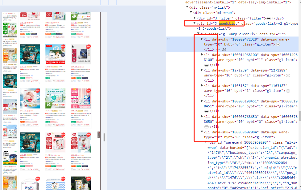 也就是我们可以在class标签下的J_goodsList里面li ,对应商品的所有列表信息。