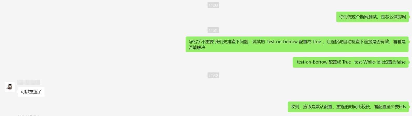 从默认配置看,testOnBorrow 设置为 false,testWhileIdle 设置为 true,闲置时间大于 timeBetweenEvictionRunsMillis 即可重连,即断网 60s 之后,才会被动去重连,如果在 60s 之类,是会有报错,还没触发重连