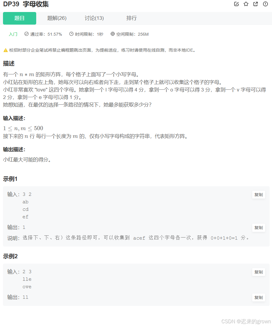 题目给了一个n*m的字符数组(方阵),让我们选择一条路径,获取最多的分数(得分规则:遇到l字母得4分、遇到o字母得3分、遇到v字母得2分、遇到e字母得1分,其他的字母都不得分);