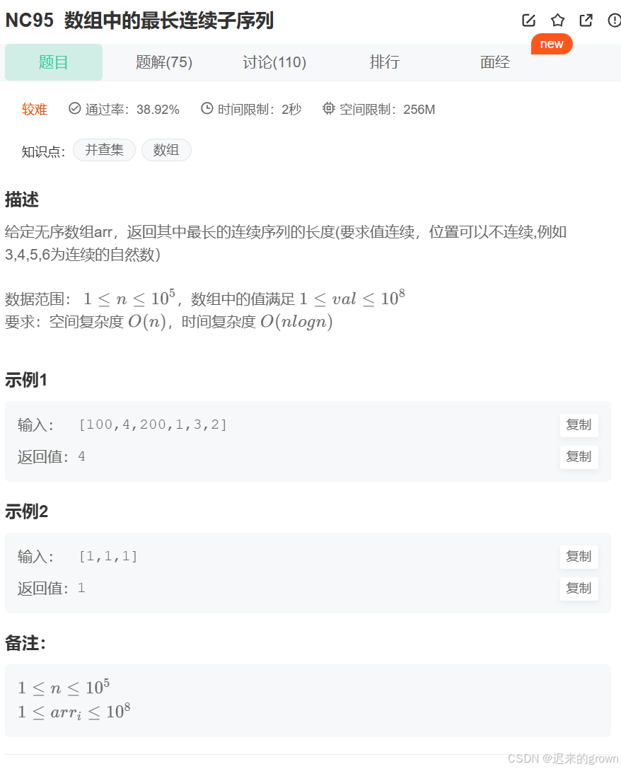 本题,题目给定一个无序的数组arr,让我们返回其中最长连续序列的长度(要求数值连续,位置可以不连续)就例如3,5,6,4,只要数值是连续的自然数就可以。