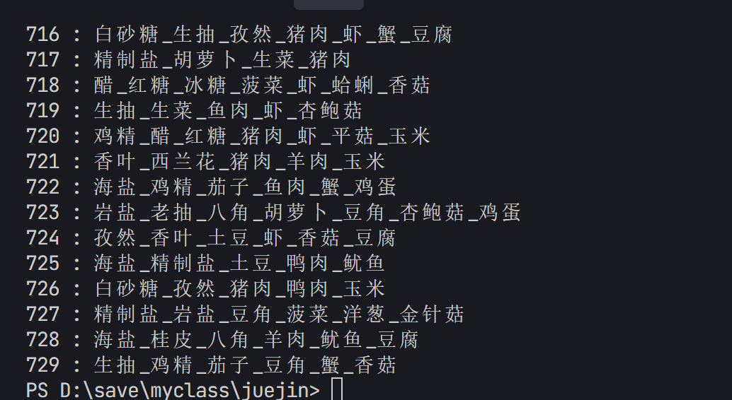 seasonings = ["精制盐", "海盐", "岩盐", "白砂糖", "冰糖", "红糖", "花椒", "八角", "桂皮", "香叶", "孜然", "豆瓣酱", "甜面酱", "番茄酱", "橄榄油", "生抽", "老抽", "醋", "料酒", "鸡精"]