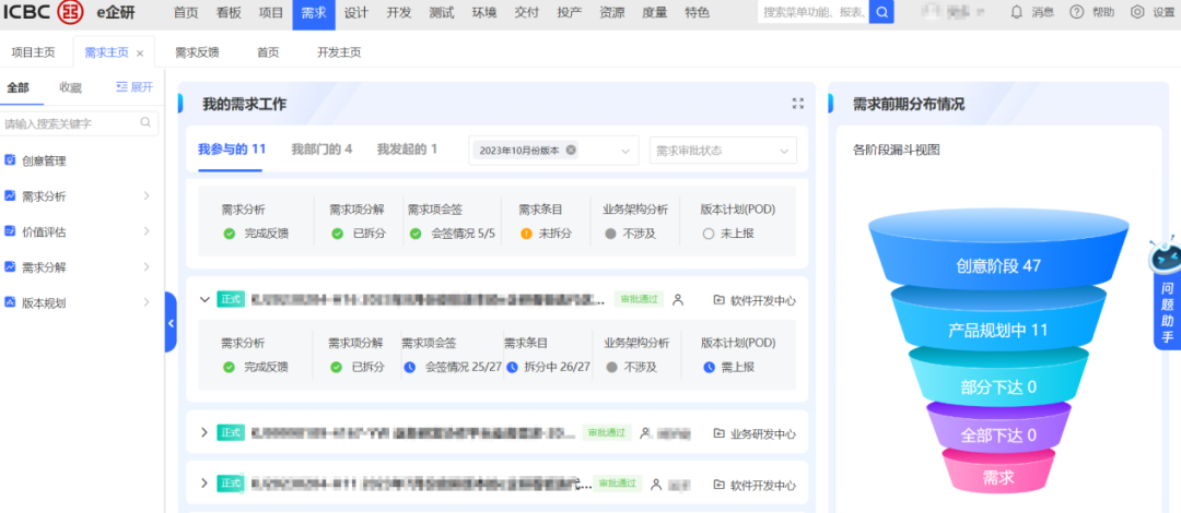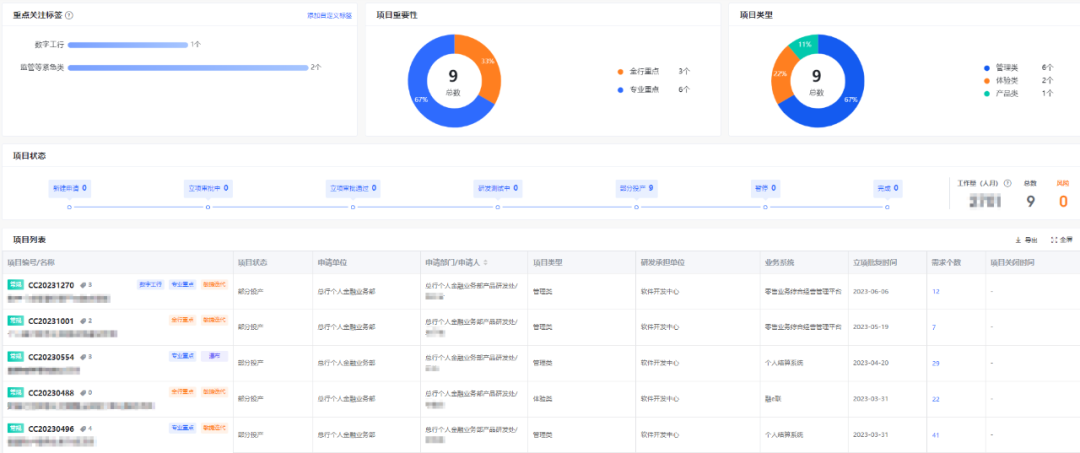 (1)业务与科技协作的需求看板:围绕业务价值从创意孵化到投产的全流程,建设创新计划、项目、需求、研发多层级看板视图,从大到小、从宏观到微观逐层细化,建立了业务与科技共享的端到端价值流,赋能跨机构业务科技柔性团队,实现业务人员与科技人员的双向协作,解决业务人员不清晰需求排期、科技人员不了解业务需求规划等痛点。