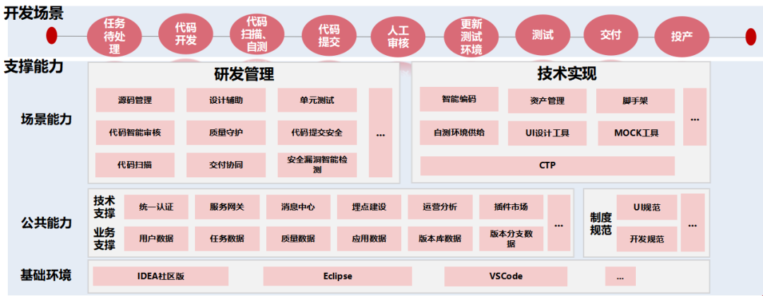(3)以 IDE 为触点的开发人员工作台:面向开发人员的编码场景,以 IDE 工具为触点,对接各领域研发管理系统,将任务处理、版本库获取和权限申请、代码开发、代码扫描、代码提交、人工审核等研发场景所需的各系统能力进行整合,结合大模型辅助 UTDD 案例自动编写、安全漏洞智能监测、代码自动生成、补全、问题定位、智能审核等能力,贯通研发全流程,有效提升编码效率,为开发人员提供一站式、智能化、沉浸式的研发体验,提升开发人员研发效能。