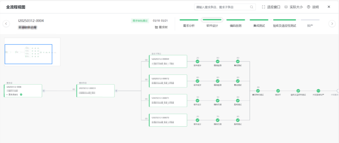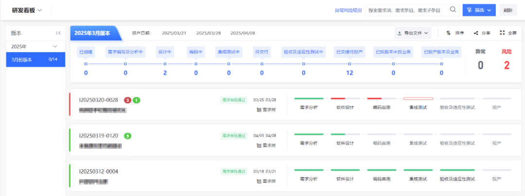 (2)研发团队之间协作的研发看板:以需求项为核心贯通“需求分析、软件设计、编码自测、集成测试、验收及适应性测试、投产”六大环节,建立端到端的价值交付全视图,及时揭示研发过程中的风险异常,帮助研发团队降低管理成本,提升研发团队之间的协作效率。