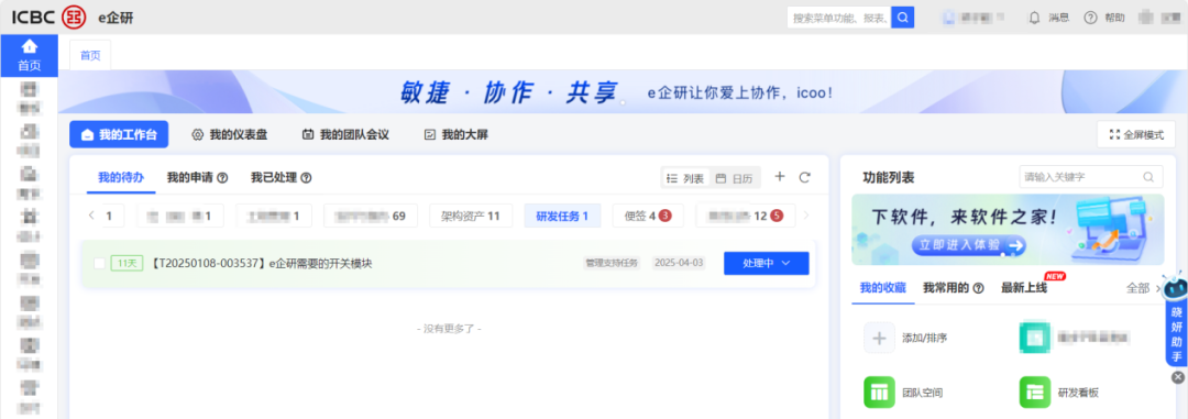(1)一站式的个人工作台:以 e 企研首页为触点,深度整合 DevOps 工具链的能力,按用户场景聚合各个系统的服务,打通研发流程和数据,解决用户切换多个系统工作和数据共享不足的问题,建设聚焦员工高频使用的待办中心、关注事项、消息通知、帮助中心以及基于数字员工“阮晓妍”的辅助服务,重点打造一站式个人工作台。用户在个人工作台可一站式处理待办事项、配置化的管理关注事项、订阅消息提醒等,有效提升了用户的工作效率和研发效能。