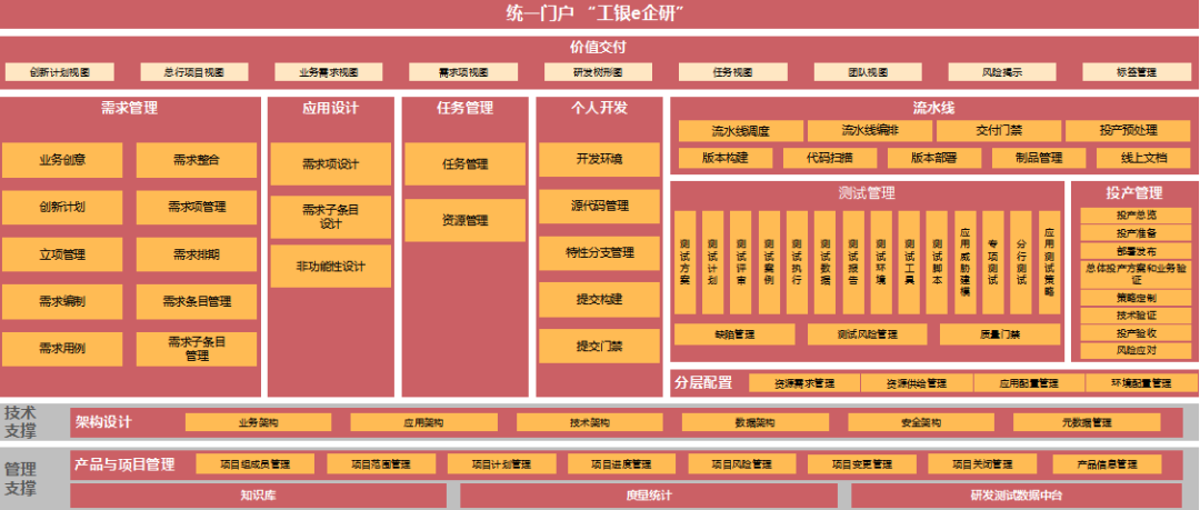 以 14 个基础服务域为基础,通过统筹跨服务域的信息共享,跨服务域的协同,开展服务化重构,建成一站式的企业级 DevOps 研发管理统一门户“工银 e 企研”。面向一线研发人员、专业经理及各层级管理者,提供全量研发管理业务功能,解决了目前研发管理数据系统多、渠道分散、数据共享不足等问题,实现了从业务需求到投产运维的全流程可视化,促进价值的高效流动和信息实时共享,提升研发效能。