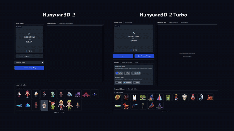 生成速度对比 - Hunyuan3D-2(左)和 Hunyuan3D-2-turbo(右) 生成速度对比明显,其中 turbo 模型在点击操作后很快生成