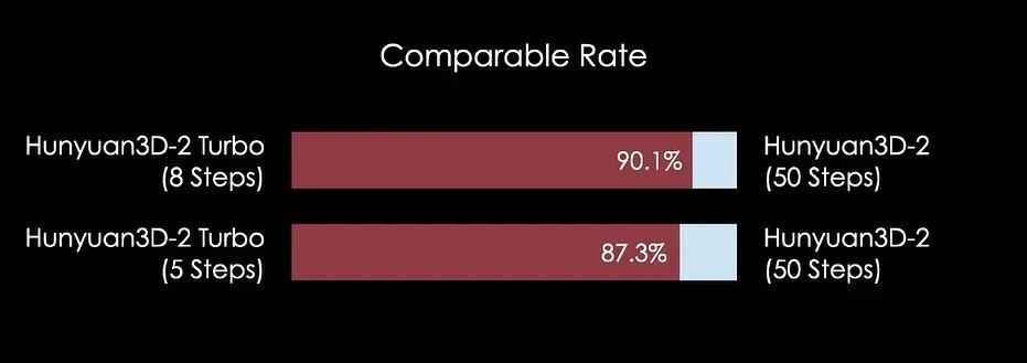 通过对Hunyuan3D-2 加速版模型(Turbo模型)和标准版(Hunyuan3D-2)进行用户双盲对比测试。结果显示,在5步迭代条件下,87.3%的生成结果对比组中,测试参与者无法从视觉上区分Turbo模型与标准版的输出差异。当迭代步数提升至8步时,无法区分差异的结果对比组比例上升至90.2%。