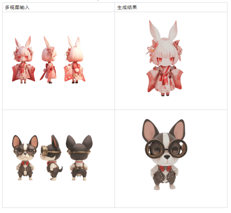 为了保持灵活性与鲁棒性,在训练过程中首先使用固定图片数量、固定角度的多视图训练模型;然后逐步增加渲染输入图的角度变化,提升鲁棒性;最后随机drop部分视图,以支持不同图片数量输入的3D生成。通过这种渐进式的训练方式,可以使得多视图版本模型支持不同数量的多视图输入,用户使用更加灵活便捷,对输入视角的角度敏感性更低。