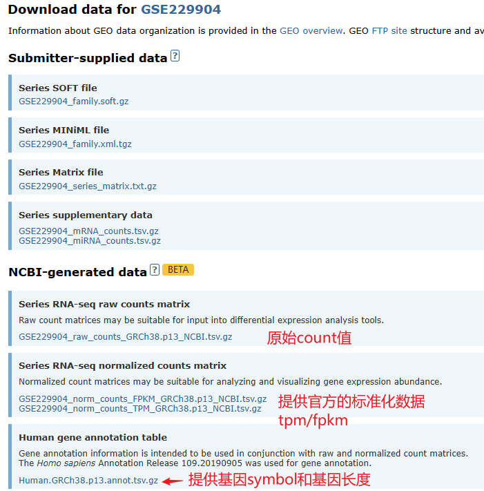 下面就是用GEO的转录组测序数据进行一下实战,正好GEO数据库对二代高通量测序数据统一进行了自己的处理,每一个数据都有count值,tpm值以及fpkm值。