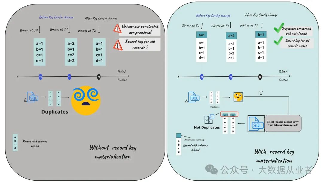 记录键用于在Hudi表或分区内唯一标识一条记录。通过记录键,Hudi能够避免重复数据,并在写入时强制唯一性约束(类似数据库的主键)。此外,记录键还用于以下场景: