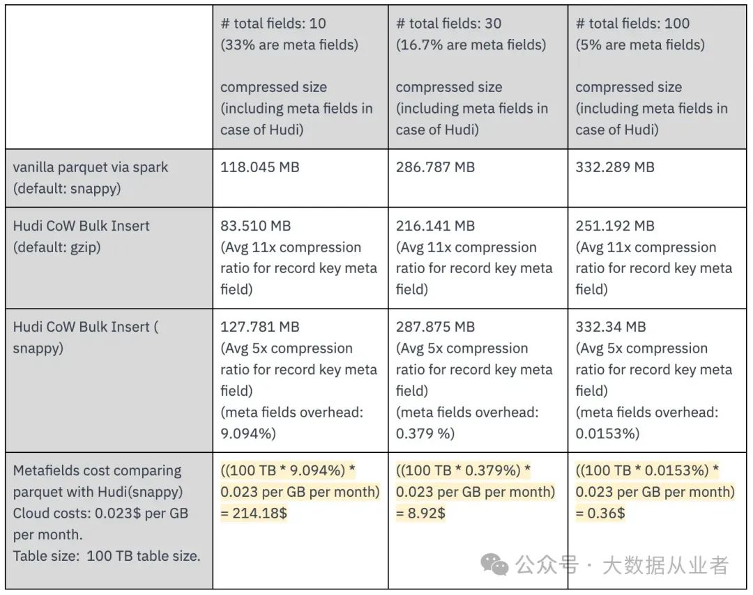 为量化元字段的存储成本,Hudi团队进行了基准测试,对比原生Parquet表与Hudi表的存储占用:
