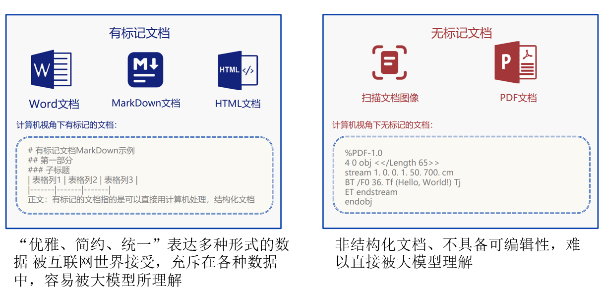 在企业内部,文档类型呈现显著的多样性特征,主要可分为有标记格式和无标记格式两大类。