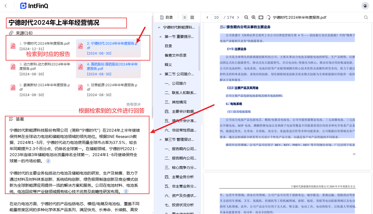 知识检索可以直接输入业务关键词进行全平台知识检索,输入“宁德时代2024年上半年经营情况”,它会快速呈现与之相关的各类信息,包括财务数据、市场份额变化、新产品发布情况等。这种高效检索能力,不仅能满足用户对特定信息的获取需求,还能帮助用户在海量数据中挖掘出有价值的洞察。