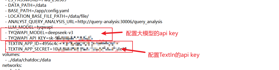 然后进入compose目录,并打开docker-compose.yml,将API ID和Secret Key填入到compose/docker-compose.yml文件中相应位置(有chatdoc-proxy、chatdoc、backend三处),另外还要将大模型的api key填入到compose/docker-compose.yml文件中相应位置(有chatdoc-proxy、chatdoc两处):