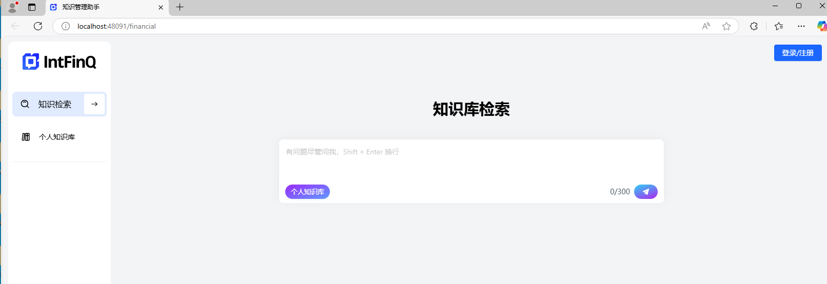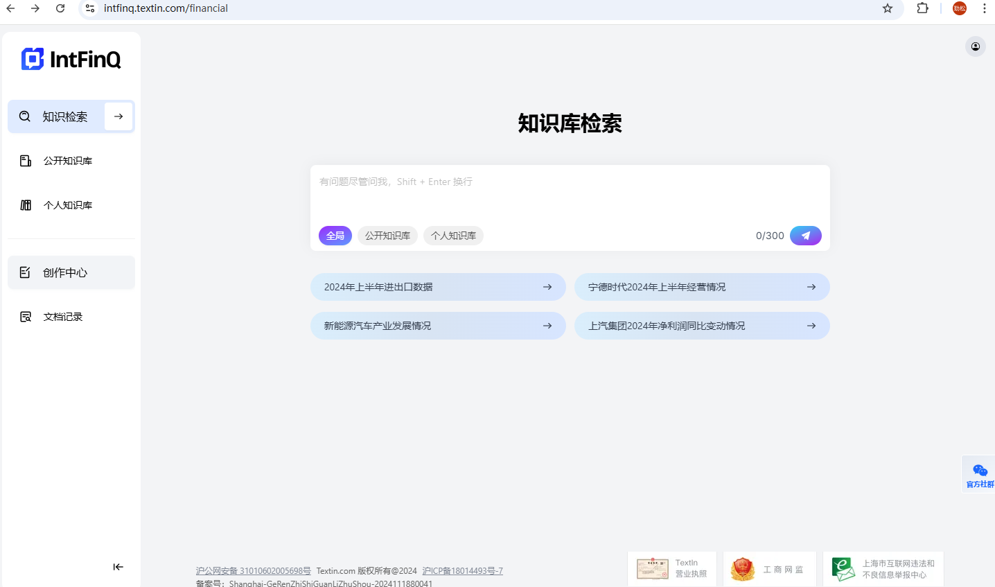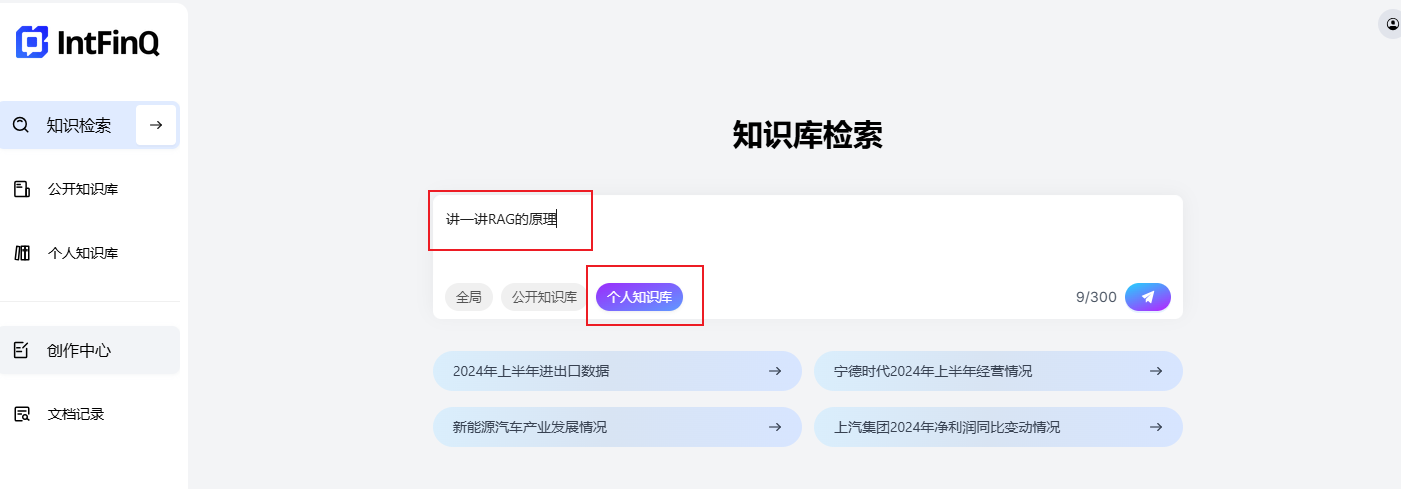 IntFinQ控制台包括知识检索、公共知识库、个人知识库管理和一个内置了AI的创作中心。