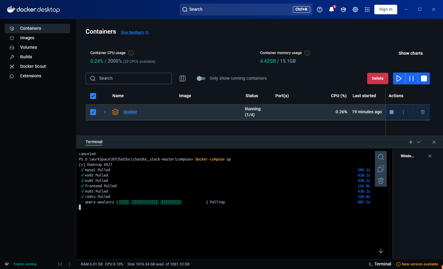 然后打开控制台,输入docker-compose up拉取docker镜像: