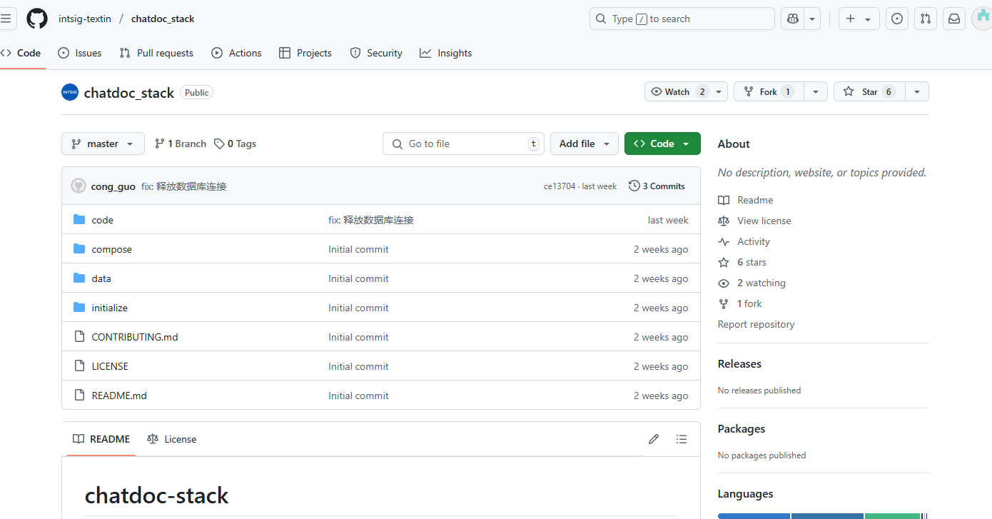 本来体验到这里也快要结束了,但是我惊喜的发现,合合信息技术团队开源了IntFinQ的社区版chatdoc_stack代码,并且还在不断地维护中,仓库地址在这里:https://github.com/intsig-textin/chatdoc_stack