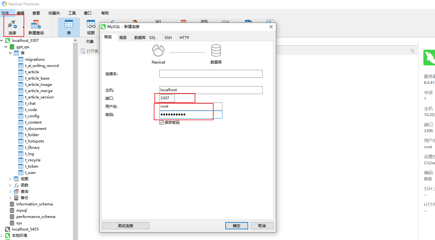 打开Navicat,新建一个端口号为3307的本地连接,用户名和密码在docker-compose.yml文件中也给了,默认分别是root和Pwd_250309: