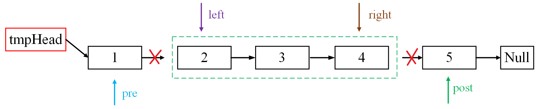 (1)定义一个临时链表头节点;(2)定义(找到)截取区间外的指针变量:pre、post,截取区间指针变量:left、right;(3)切断链接;(4)翻转局部链表;(5)接回原来的链表。对于第4步局部反转用到了上一篇所讲的内容。