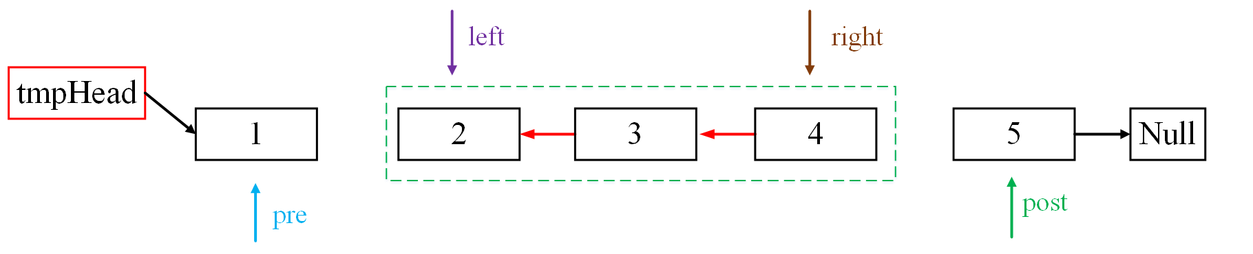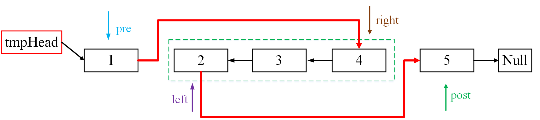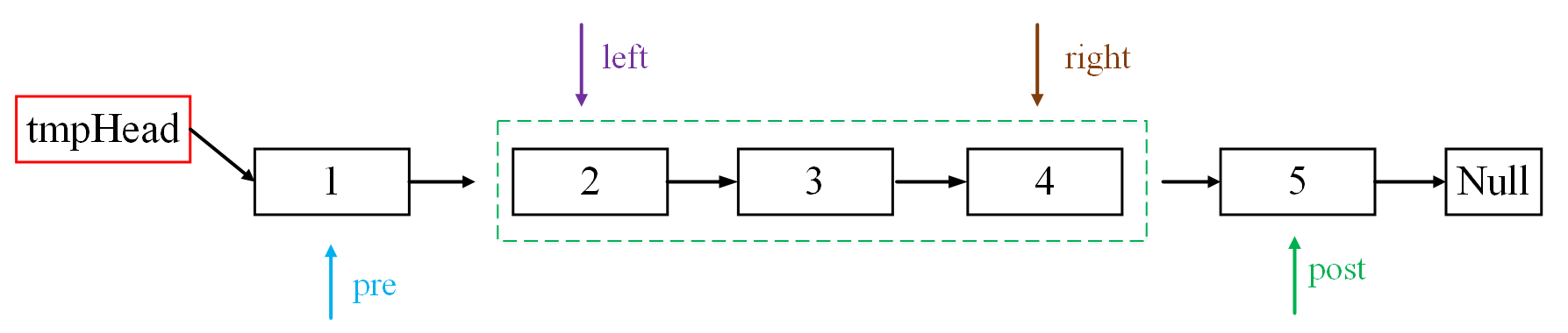 输入:输入:head = [1,2,3,4,5], left = 2, right = 4 输出:[1,4,3,2,5]
