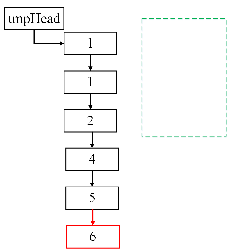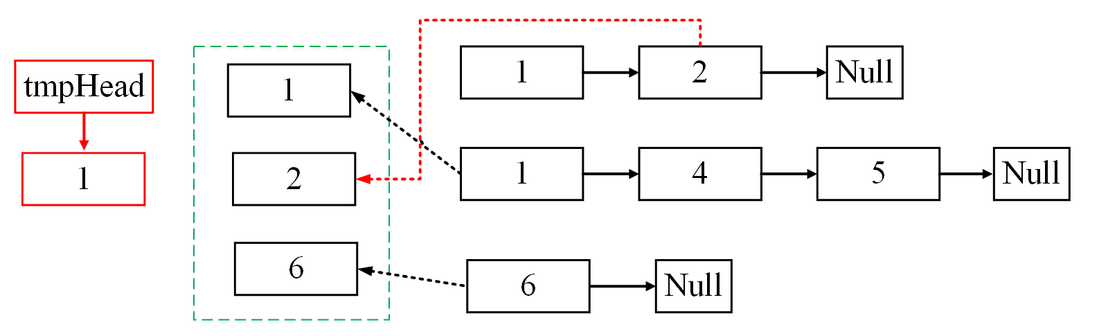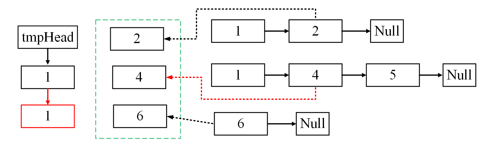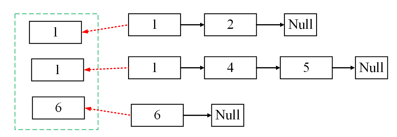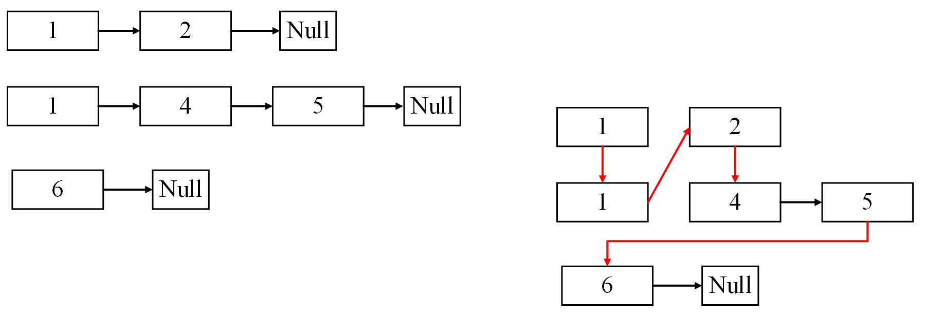 假如链表分别为:1→2、 1→4→5与6,合并之后为:1→1→2→4→5→6,结构如下图所示: