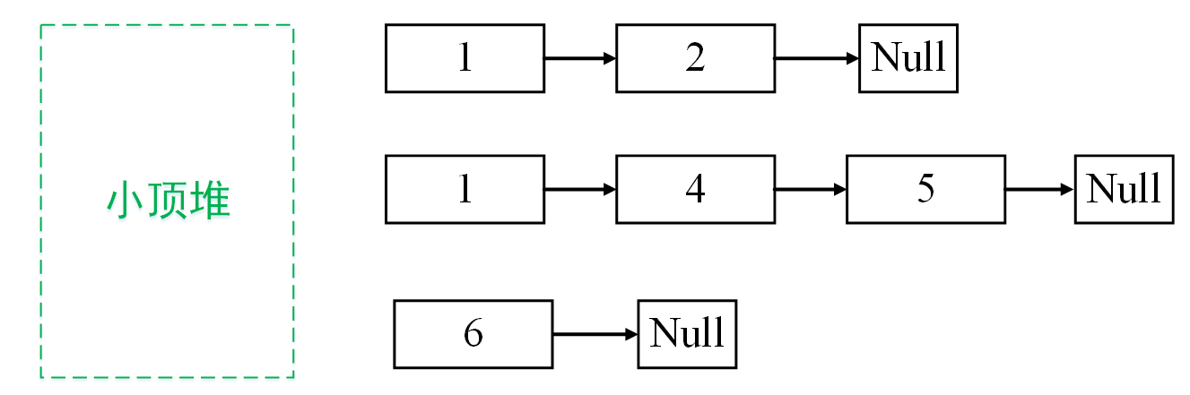 链表的第一个节点加入到堆中之后,堆会根据链表节点的值进行堆化,将节点值最小的放到堆顶,如下图所示。