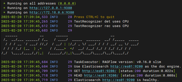 $ docker logs -f ragflow-server出现以下界面提示说明服务器启动成功: