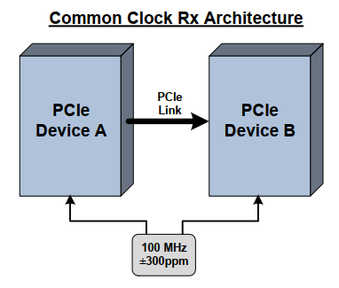 Common Clock Architecture:所有设备的参考时钟分布必须匹配到15英寸以内在系统板上。在接收端数据和时钟之间的传输延迟增量必须要小于等于12ns。通常允许PCIE卡上的时钟线长不大于4inch。特别注意这点,涉及到我们实际PCB走线。