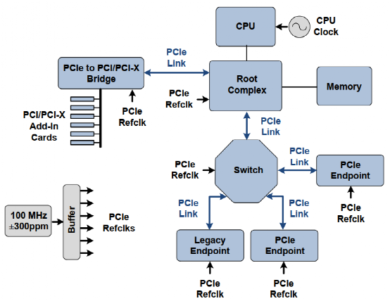 首先先看下PCIE架构组件:下图中主要包括了CPU(ROOT COMPLEX),PCIE SWITCH,BUFFER以及一些PCIE ENDPOINT;而且可知各个器件的时钟来源都是由100MHz经过Buffer后提供。