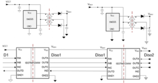 需要提醒的是,数据手册的爬电距离参数的对象芯片,如果系统中有更短通路,那么这个更短距离才是这个电路的隔离爬电距离。这里举个例子,下图将两颗超宽封装ISO7841DWW(creepage是14mm)串联工作,是否可以理解成该电路的爬电距离是28mm呢?答案是不可以。这是因为电路中除了数据传输通路还存在一个通路,即隔离电源电路。VCC1 和Viso2之间的爬电距离可能比D1和Diso2之间的爬电距离更短,而更短的距离值决定了电路的爬电距离值。