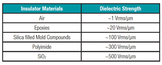 此表列举了常见的绝缘材料和对应的隔离能力(Vrms/um)。光耦器件对材料透光性的要求,使得多选用空气(Air)和环氧树脂(epoxies)作为隔离材料。聚酰亚胺(polymide)多为磁隔产品选用。而容隔器件则选用绝缘强度最优的二氧化硅(SiO2)材料。隔离材料的选用会影响到器件的体积,容隔器件有明显的体积优势。聚酰亚胺(polymide),二氧化硅( SiO2)的可靠性不会因为在潮湿环境工作而受到影响。