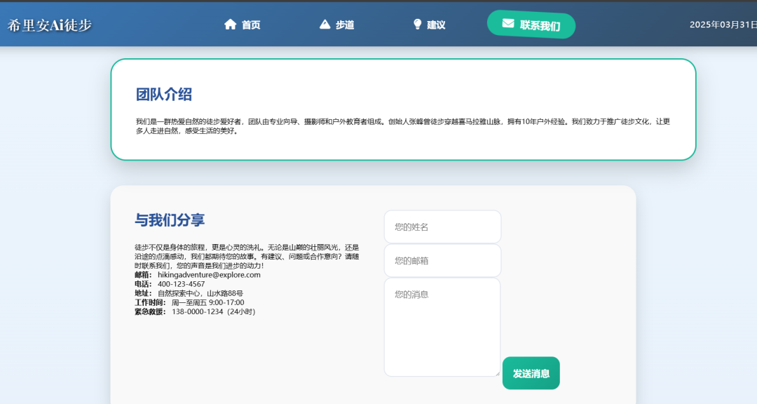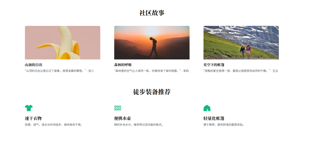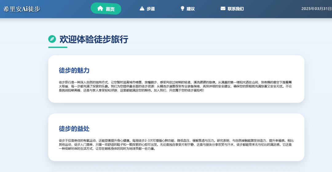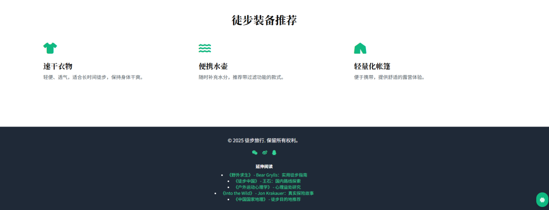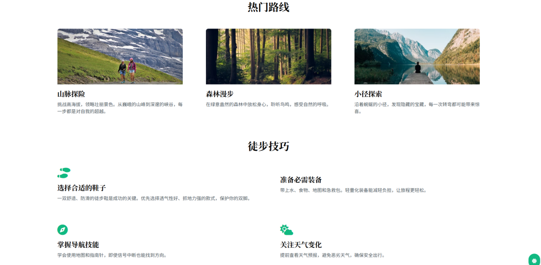 以上说到徒步的事,就用ai生成一个徒步旅行的落地页,咱们看看效果怎么样,这里使用普通的问答模式