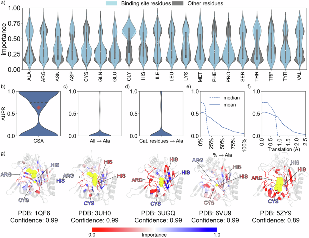 为了测试来自局部形状或专家化学知识的化学信息的影响,作者使用了从CSA获得的364个酶。图3b显示了每个类别的AUPR分布。在零和一处分布较广,因为在该数据集中特定类别的酶通常只有一个(364个酶中有295个类别)。为了测试化学与形状的影响,作者计算机模拟将所有残基突变为丙氨酸,这不会改变残基网络的蛋白质形状(图3c)。作者还将仅催化残基突变为丙氨酸(图3d)。在这两种情况下,网络性能都明显下降。作者测试了在失去准确预测所需的化学知识之前,能随机突变多少残基(图3e)。虽然随着更多突变,平均AUPR缓慢下降,但中位数AUPR在突变约20%的残基时急剧下降,表明局部侧链信息对学习过程至关重要。为了测试能扰乱多少形状表示,作者将残基位置随机平移0.0至2.5 Å(图3f)。从0.75 Å开始的平移会降低网络性能,这对应于约4.5 Å57的晶体结构分辨率。