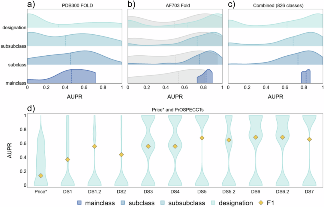 在测试计算生成的酶结构之前,作者希望获得基线性能。作者使用预测的结合位点为实验确定的酶结构创建了折叠分割,以获得更多训练样本,即PDB300数据集。图2a显示了每个EC的精确率-召回率曲线下面积(AUPR)分布。这个数据集的F分数较低,主类为0.66,亚类为0.53,次亚类为0.45,名称级别为0.39。