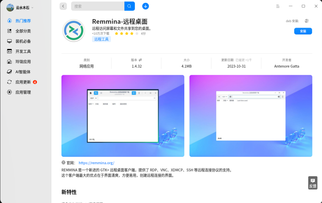 接下来配置主控端。在主控端,VNC 客户端有多种选择,我选择了我一直在使用的 Remmina 远程桌面,它可以从 UOS 应用商店中下载安装。