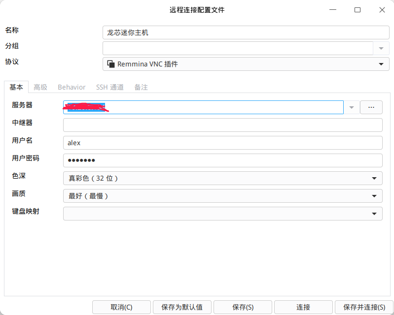 在配置界面中,选择 Remmina VNC 插件作为协议,填写被控端计算机的 IP 地址,并输入该计算机系统的用户名和密码。完成设置后,点击保存并连接,就可以看到被控端的桌面了。