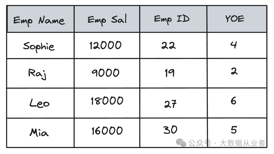 假如员工信息的数据集,其中包括员工薪资(Emp Sal)和工作年限(YOE)等属性。以下表格展示了部分记录: