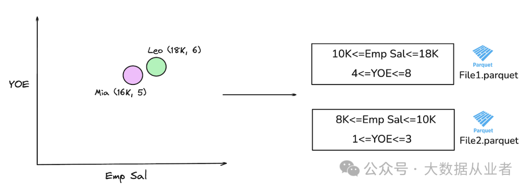 将Z-order聚类应用到上述示例中,我们可以组织文件,使其同时利用员工薪资和工作年限这两列进行聚类。当查询引擎处理示例(查找薪资超过 10,000 且工作经验超过 4 年的员工)时,可以快速在单个文件(例如,在这种情况下为 File 1.parquet)中定位数据,如下图所示。