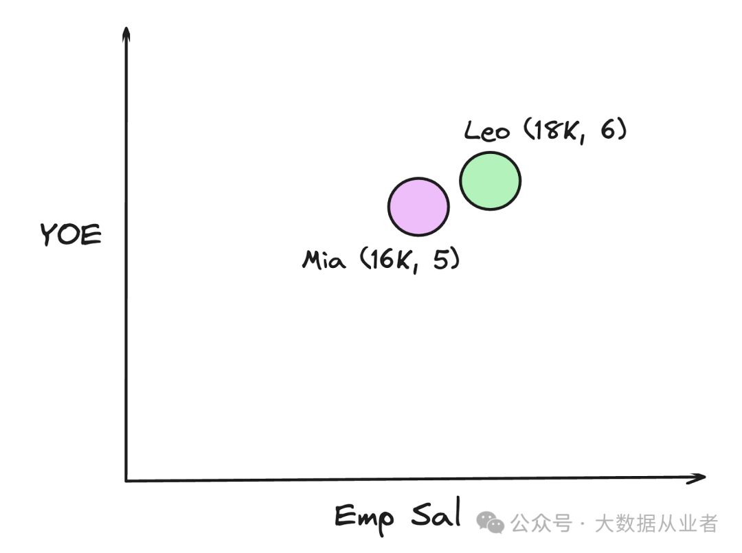在这个数据集中,像Leo和Mia这样的员工在员工薪资和工作年限这两个属性上具有相似的值。如果我们在一个二维空间中可视化这些数据,将员工薪资放在一个轴上,工作年限放在另一个轴上,我们可以看到利奥和米娅在这个二维空间中彼此更接近,这反映了他们相似的薪资和工作经验水平。