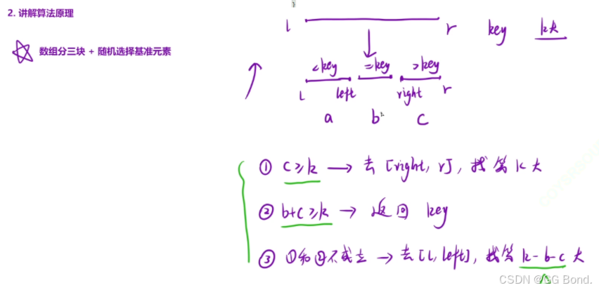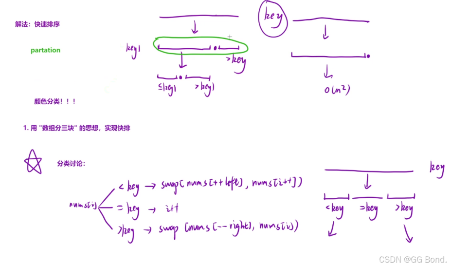 解释: 这里我们要实现的快排的核心与上一题很像,都是通过三指针的方法,将数组分为三块,但是这里有几个需要特别注意的点: