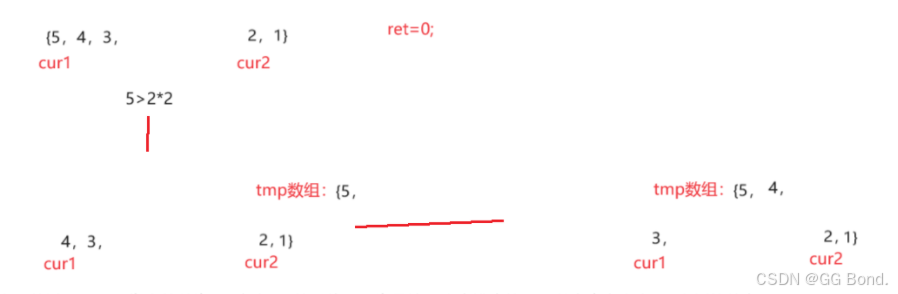 我们看上面的过程,cur1指向的数为5,它大于2的两倍,因为是按照降序排序的,所以它肯定也大于2右侧的数字,所以ret+=right-cur2+1,计算过后我们就需要把5先放入tmp数组中,然后再看4,4不大于2的两倍,所以ret不变,然后把4放入tmp数组中,此时就出现了问题,因为4虽然不大于2的两倍,但是它大于2的两倍,也就是说4没有与2右侧的数进行比较,就因为排序的条件的限制进入了tmp数组中了,所以我们需要把这两步分开处理