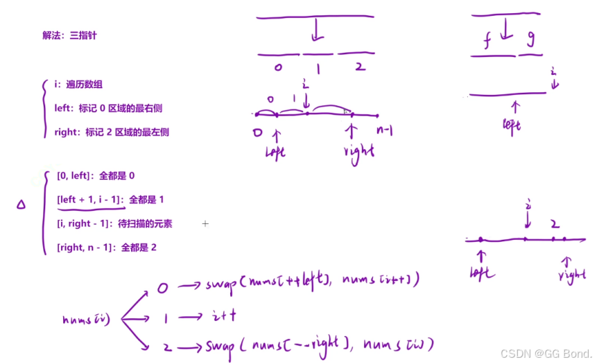 n == nums.length1 <= n <= 300nums[i] 为 0、1 或 2我们先来看一下题,题意简单点来说就是分类,将0、1、2三个数分类合在一起,这与有一个移动0的操作非常相似,不同的是那个题是将两个数分类,那个题用的是双指针,类比,这个题我们可以用三指针来操作,下面我们来看一下如何用三指针来解这道题