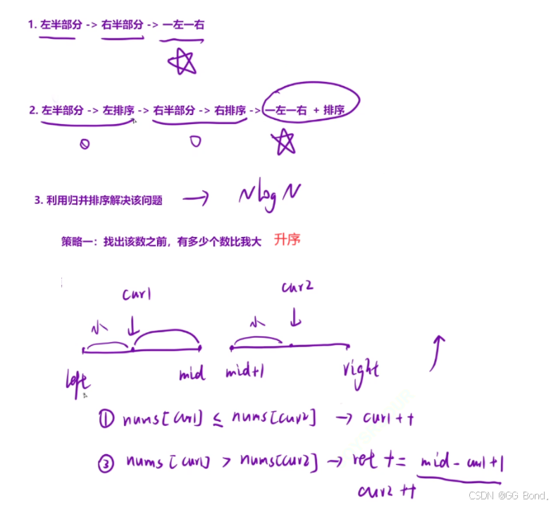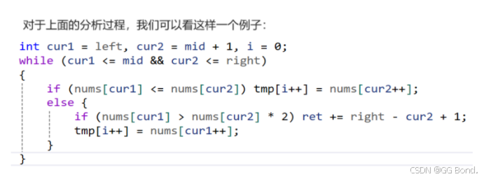 这道题与前面计算逆序对个数的题挺像,但是还是有所不同在计算逆序对的时候我们在进行数组排序的过程中就能计算逆序对的个数,因为判断条件是一样的,但是这个题不行 比如当我们按照降序排序时: 排序的条件:nums[left]<=nums[right] 计算翻转对的条件:nums[left]<=nums[right]*2 也就是说它们的判定条件不同,所以需要在不同的循环中进行,所以我们可以先计算逆序对的个数,然后再进行排序