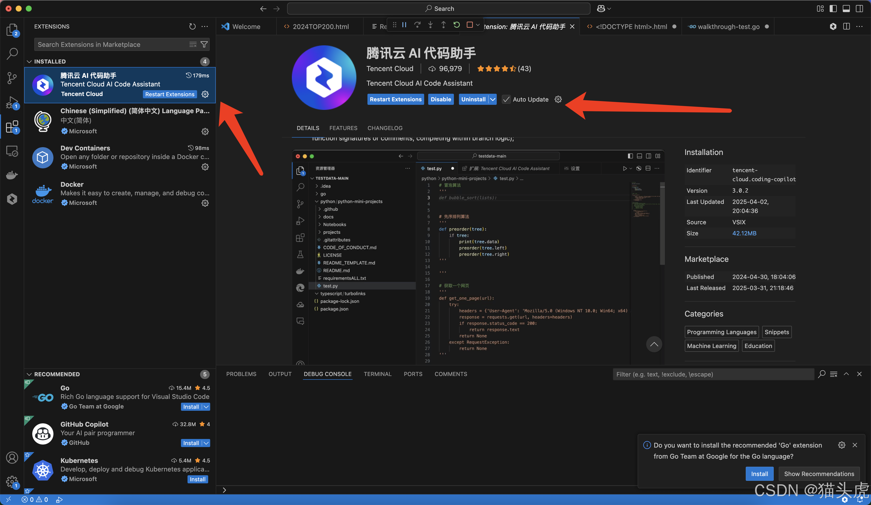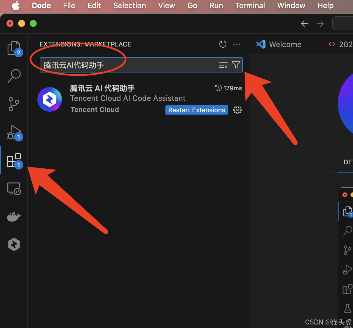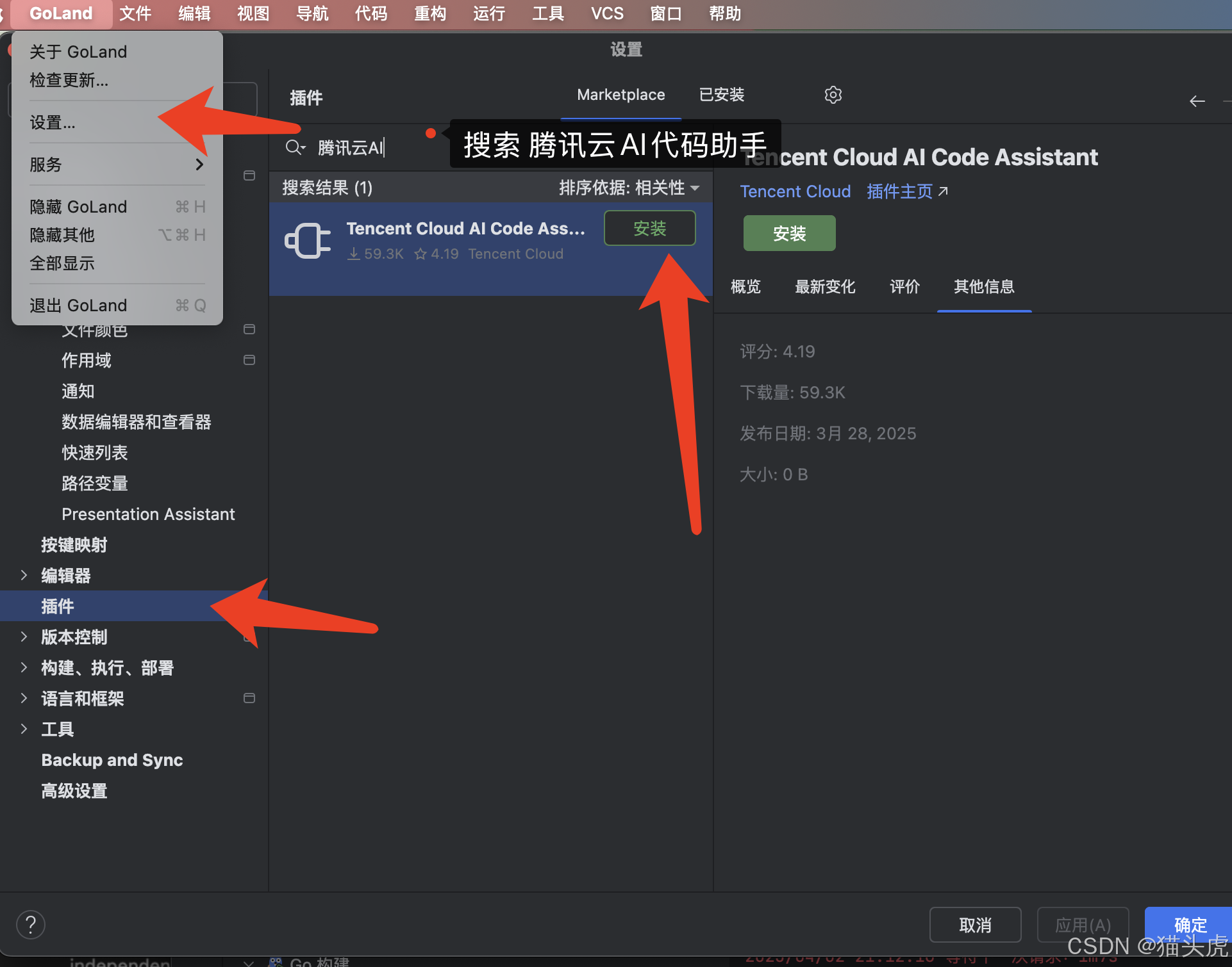 2. 打开IDE,搜索并安装“腾讯云AI代码助手”插件,完成登录即可开始使用。