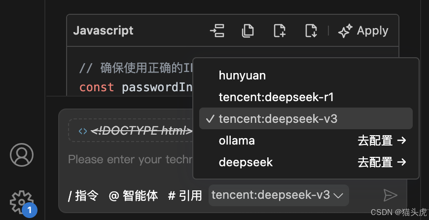 只需更新腾讯云AI代码助手插件,在对话框左下角选择 tencent-deepseek-v3 模型即可。如果你还没有安装代码助手,可以通过以下方式获取。