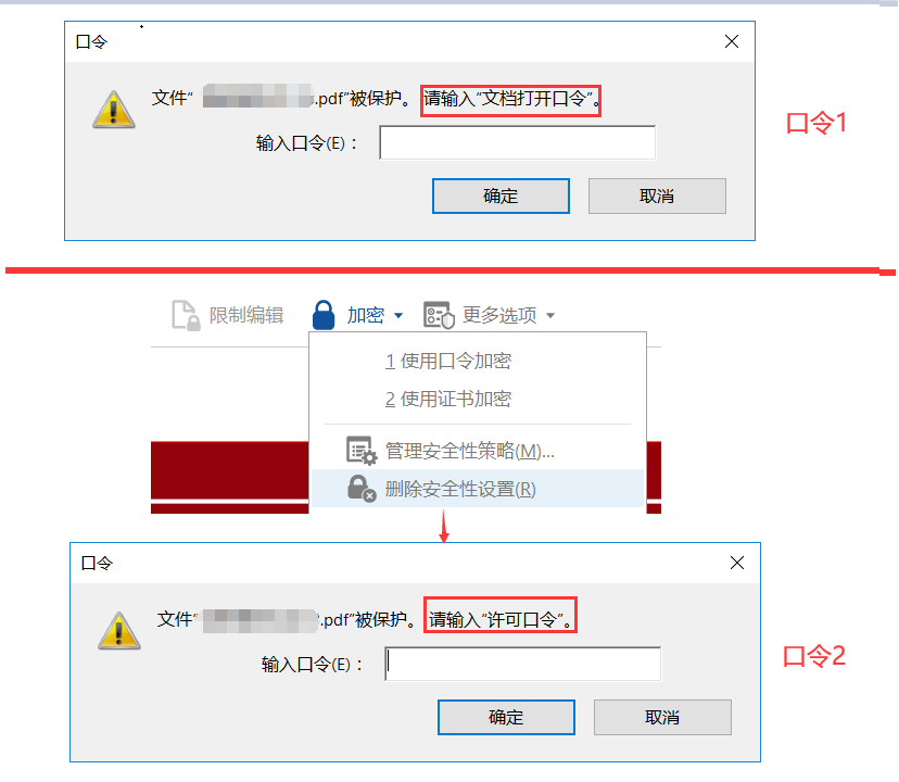 “保护”选项中的“删除安全性设置”来去除密码,然而有些时候即便你知道PDF的打开密码也不能去掉,原因如下: